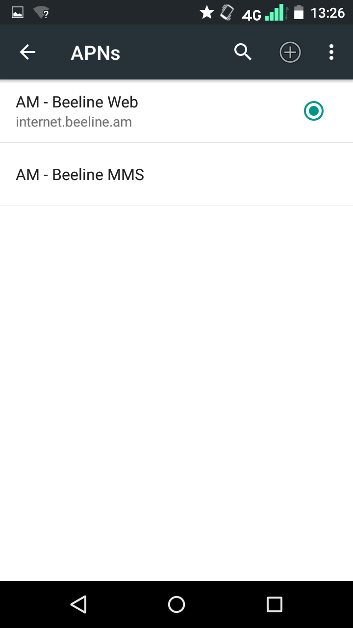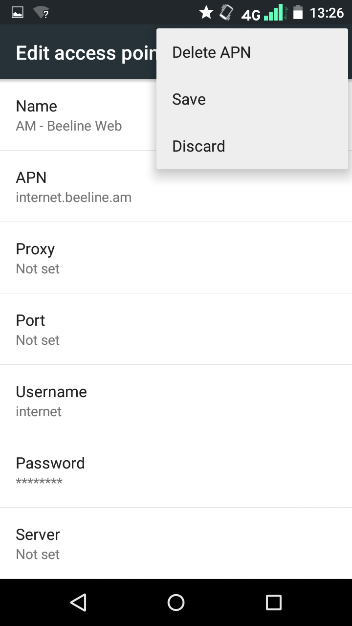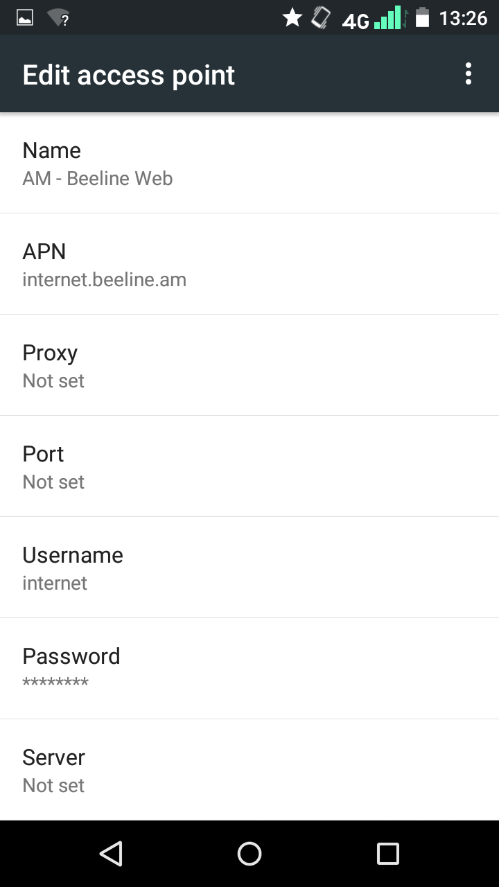 Fill in the following fields: APN – internet.beeline.am Username – internet Password – internet