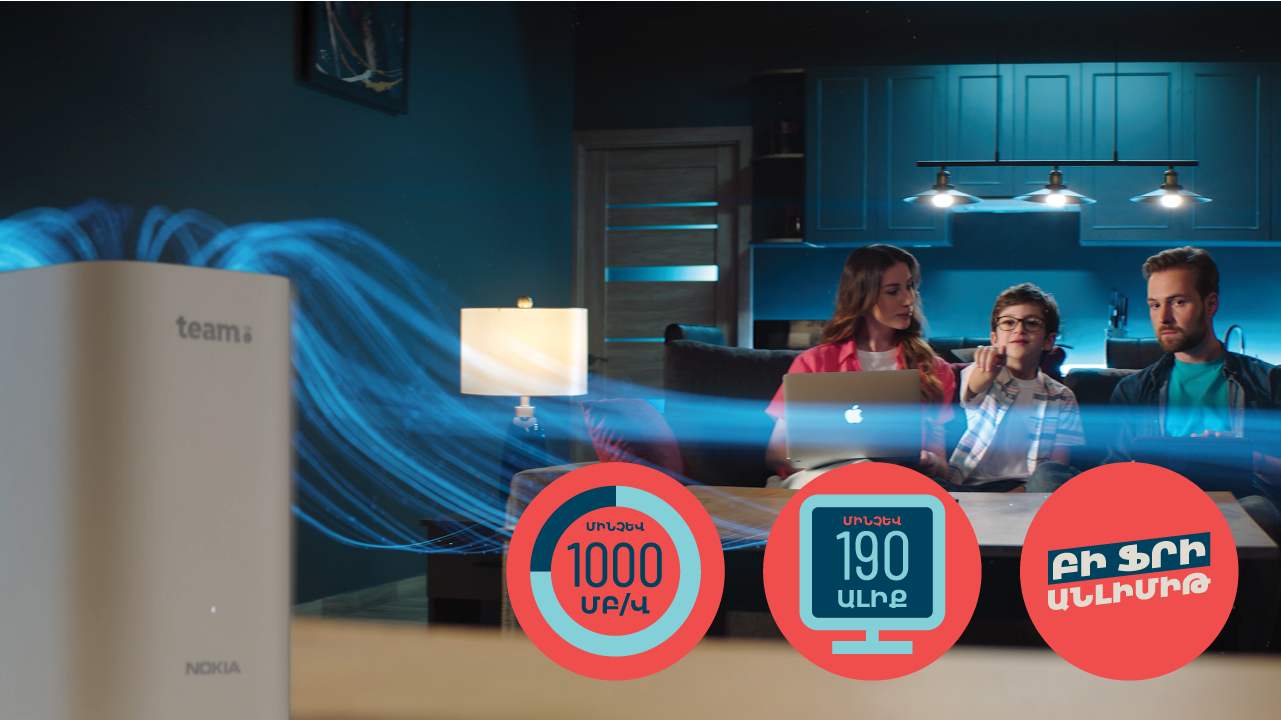Բաժանորդագրվելով Team-ի COSMO և COMBO փաթեթներին՝ հաճախորդի տանը, ըստ անհրաժեշտության տեղադրվելու է Nokia GPON և Nokia Beacon WiFi ուժեղացուցիչ անլար ինտերնետի անգերազանցելի որակ ապահովելու համար։