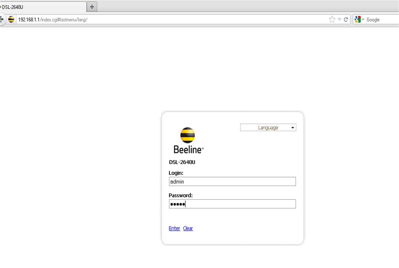 Для доступа к конфигурации модема введите в открывшемся окне следующие имя пользователя и пароль: